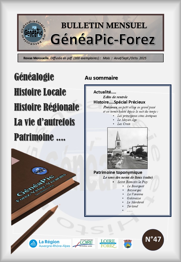 | | Nos Publications  | Depuis bientôt 3 ans, chaque début de mois, GénéaPic-Forez publie un bulletin mensuel. | Ce bulletin vous informe sur l'activité proche (passée et a venir) de GénéaPic-Forez. Vous y trouvez également périodiqueent nos principales rubriques: - Informatique
